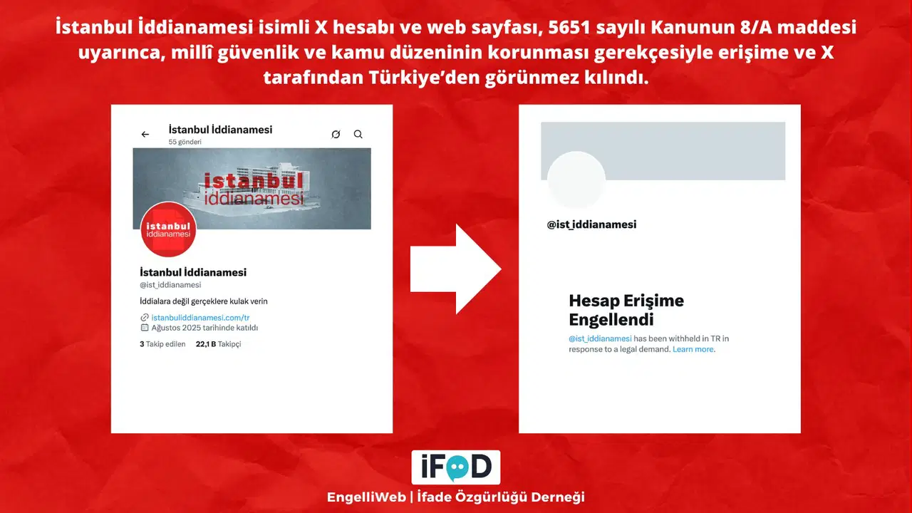 ‘İstanbul İddianamesi’ X hesabı (ist_iddianamesi) ve web sitesi, 5651 sayılı Kanunun 8/A maddesi uyarınca, millî güvenlik ve kamu düzeninin korunması gerekçesiyle erişime engellendi.
