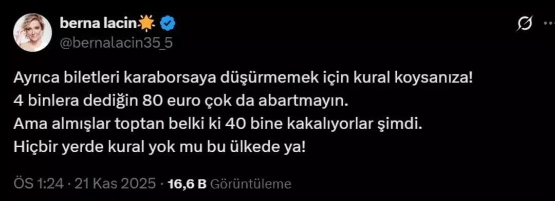 Bu duruma Berna Laçin’den tepki gecikmedi. Laçin; ”Ayrıca biletleri karaborsaya düşürmemek için kural koysanıza! 4 binler dediğin 80 euro çok da abartmayın. Ama almışlar toptan belki ki 40 bine kakalıyorlar şimdi. Hiçbir yerde kural yok mu bu ülkede ya!’ ifadelerini kullandı.