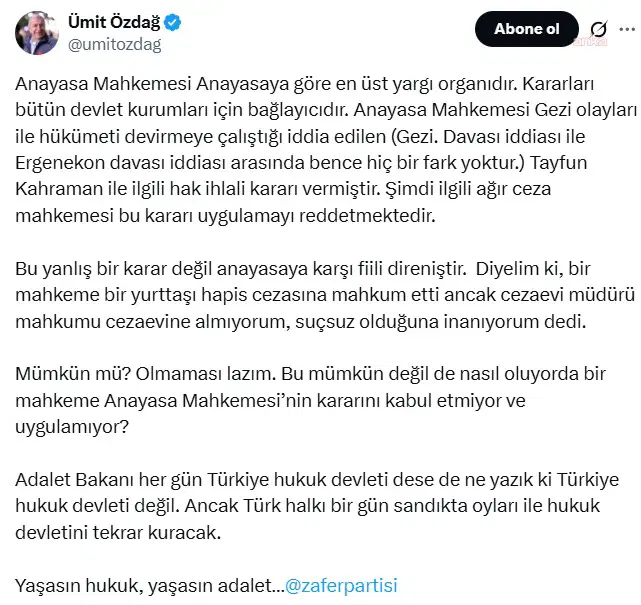 Zafer Partisi Genel Başkanı Ümit Özdağ, İstanbul 13. Ağır Ceza Mahkemesi’nin, AYM’nin Tayfun Kahraman hakkında verdiği hak ihlali kararını uygulamamasına sosyal medya hesabından yaptığı açıklama ile tepki gösterdi.